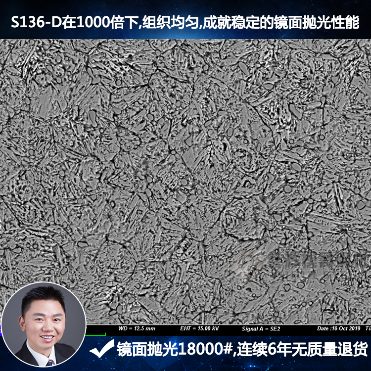 深圳高校搞金屬材料研究的阿東說:在1000倍的掃描電鏡下,看熱處理后的S136-D材料,初步分析是馬氏體+球狀碳化物+殘余奧氏體。如果單看組織來分析性能的話,S136-D的性能已經(jīng)是非常好的了。產(chǎn)品就怕扒光了看,美不美,立馬區(qū)分出來。還有世界500強,廣州捷普電子,也在持續(xù)采購,譽輝S136-D模具鋼。