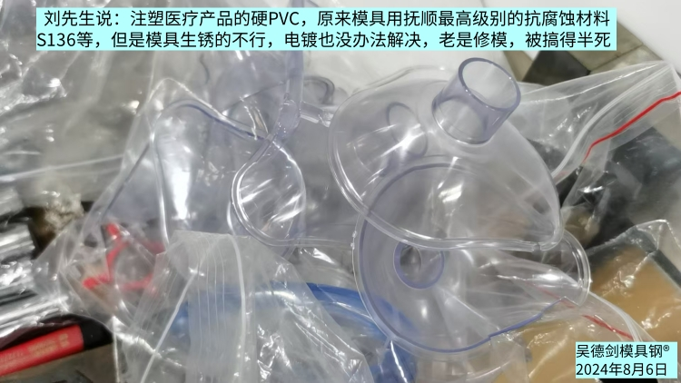 劉先生他是注塑醫(yī)療產(chǎn)品的硬PVC的料,他說(shuō)原來(lái)模具,用撫順最高級(jí)別的一款抗腐蝕模具材料,還有S136等,但是模具生銹的不行,電鍍也沒(méi)辦法解決,老是修模,被搞得半死。他去年找到我的時(shí)候,基于他是注塑硬PVC腐蝕性極強(qiáng)的材料,現(xiàn)在用的模具鋼主要的問(wèn)題也都是生銹,我就給他推薦了M316這款超級(jí)不銹鋼。