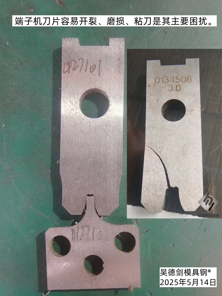 當(dāng)下的端子機刀片,遇到的主要困擾是,H13刀片容易磨損,DC53刀片容易開裂,總是找不到一款既不崩裂,又很耐磨的模具鋼,這也是端子機刀片行業(yè)的痛點。