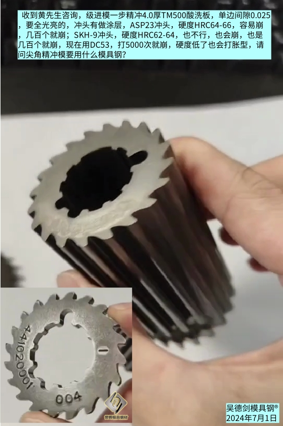 黃先生是連續(xù)模一步精沖4.0厚TM500酸洗板,單邊間隙0.025,齒輪產(chǎn)品要全光亮,沖頭有做涂層,但容易崩,換了很多款模具鋼。一開始用ASP23沖頭,硬度HRC64-66,容易崩,幾百個就崩;后來換SKH-9沖頭,硬度HRC62-64,也不行,也會崩,也是幾百個就崩;現(xiàn)在用DC53,打5000次就崩,但硬度低了也會打脹型,請問尖角精沖模要用什么模具鋼?